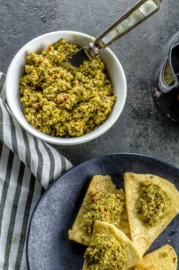 Made with a combination of green and black olives, garlic, herbs, spices and olive oil with freshly baked garlic-parmesan flatbread for dipping